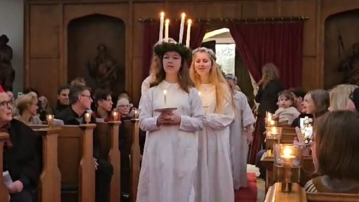 Lørdagsskolens børn går traditionen tro Lucia-optog i kirken. Vi holder en blandet dansk-engelsk gudstjeneste, hvor alle kan være med. Julehistorien bliver læst højt, og vi synger kendte julesalmer.